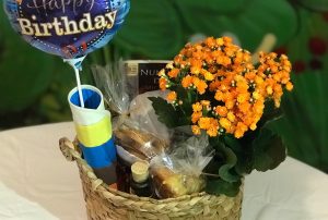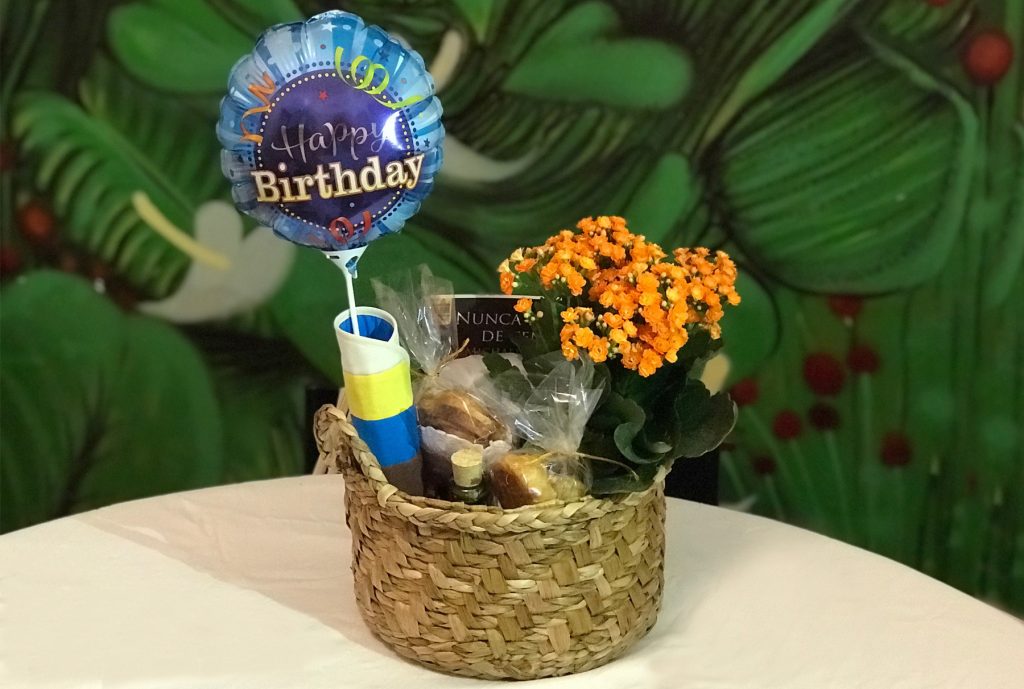 Cesta de palha, sousplats em matelassê, cachepot de crochê para flor, copo  em cerâmica Campestre, suco de laranja, bolo de cenoura, calda de chocolate, Blondie com amêndoas Lavorare,  geleia de morango com limão siciliano Lavorare, torradas, pão de queijo Empório Jardim, salada de frutas,  iogurte grego, granola Lavorare, farofinha de aveia e coco Lavorare, mel, manteiga.