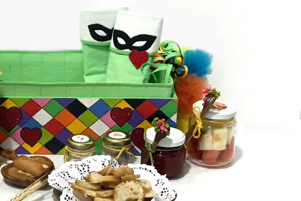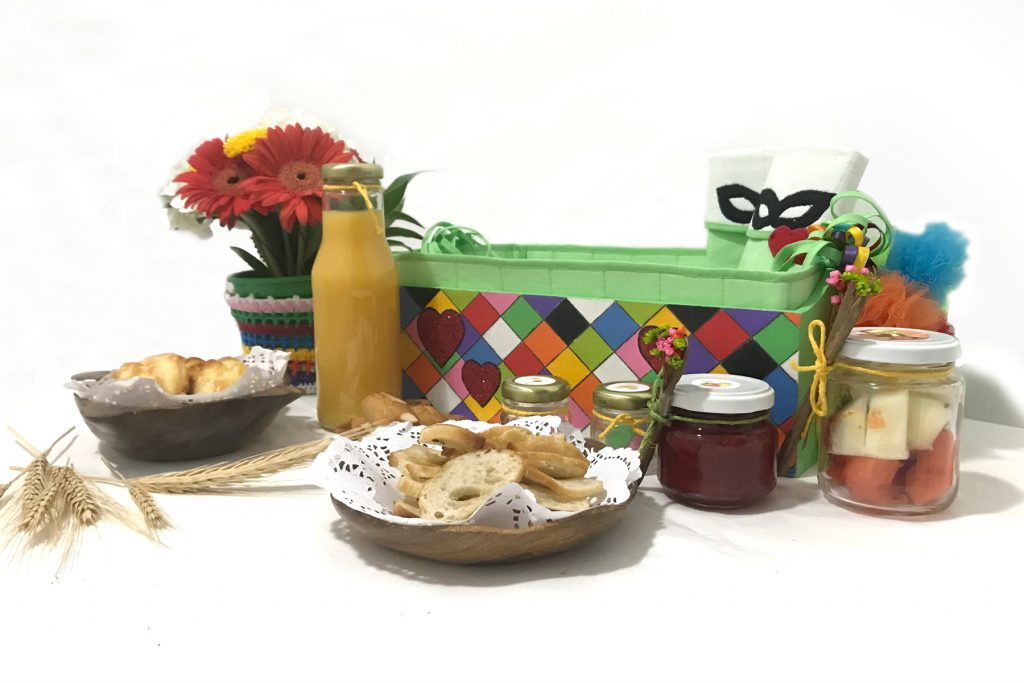 Cesta em MDF, pintada, forrada com matelassê, sousplats em matelassê, cachepot de crochê para flor, xícaras em cerâmica Campestre, suco de laranja, bolo inglês mármore, compota de jambo Lavorare, geleia de morango com limão siciliano Lavorare, torradas da Carol, salada de frutas, iogurte grego, granola Lavorare, financiar de amêndoas, mel, manteiga.