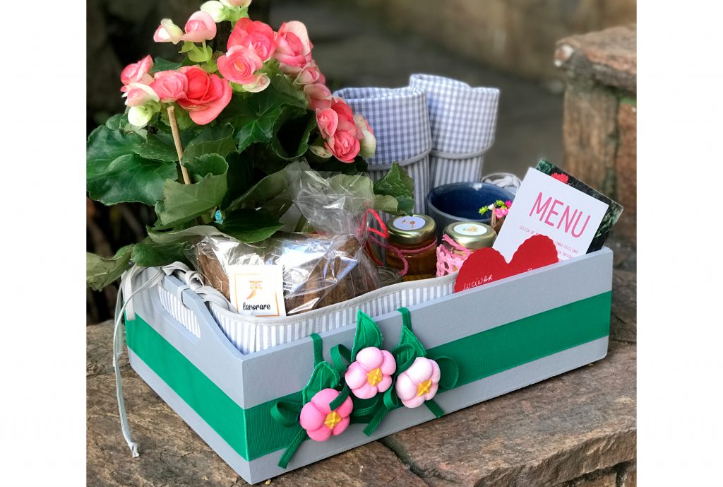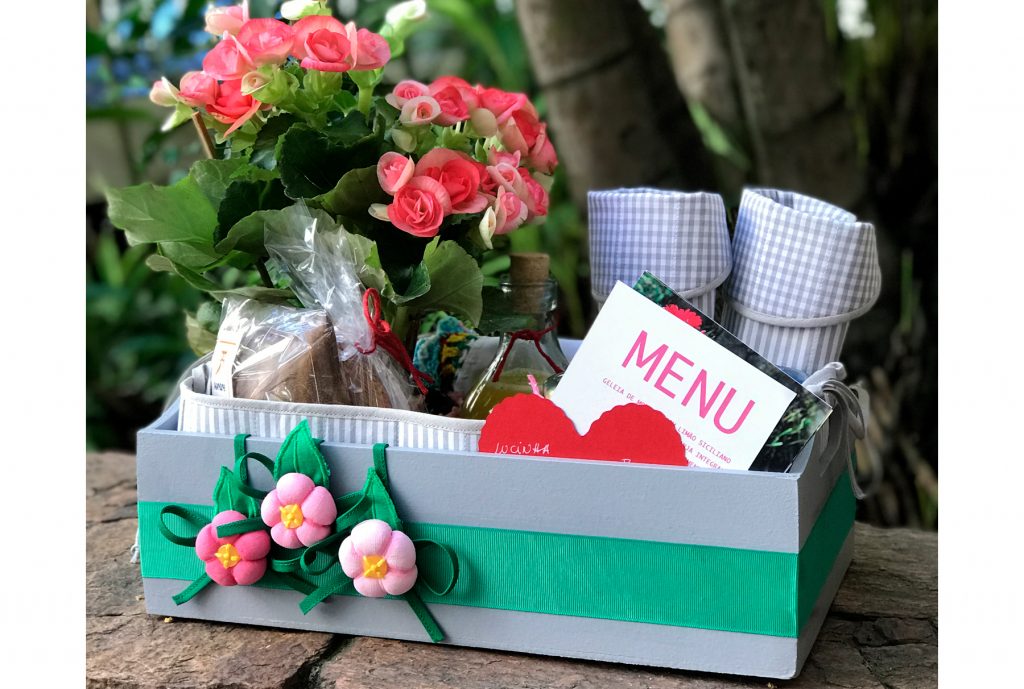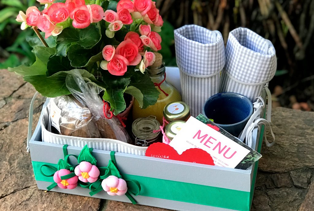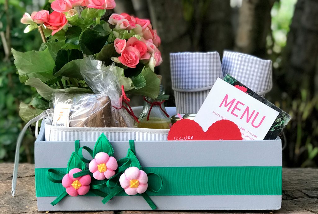 Cesta em MDF, pintada, forrada com matelassê, sousplats em matelassê, cachepot de crochê para flor, copos em cerâmica Campestre, suco de laranja, Blondie com amêndoas Lavorare, compota de morangos Lavorare, geleia de morango com limão siciliano Lavorare, torradas da Carol, salada de frutas, iogurte grego, granola Lavorare, farofinha de aveia e coco Lavorare, mel, manteiga.