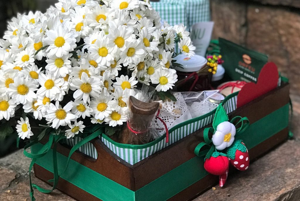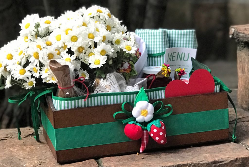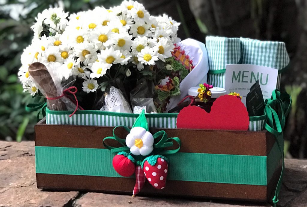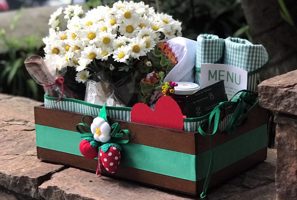 Cesta em MDF, pintada, forrada com matelassê, sousplats em matelassê, cachepot de crochê para flor, copos em cerâmica Campestre, suco de laranja, Blondie com amêndoas Lavorare, compota de morangos Lavorare, geleia de morango com limão siciliano Lavorare, torradas da Carol, pão de queijo Empório Jardim, salada de frutas, iogurte grego, granola Lavorare, farofinha de aveia e coco Lavorare, mel, manteiga.