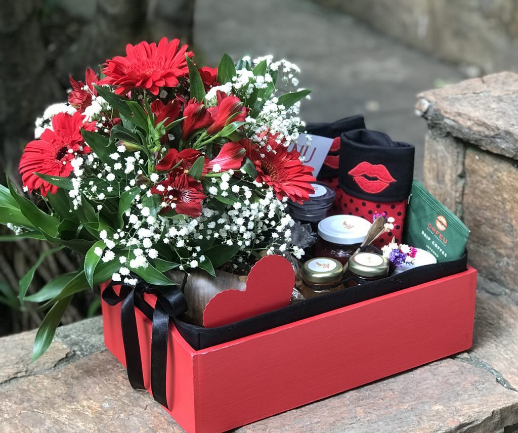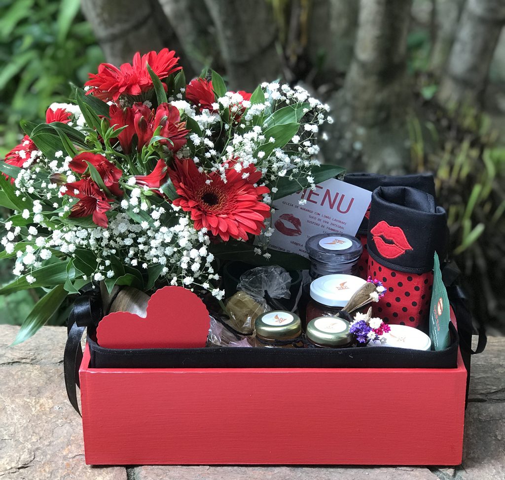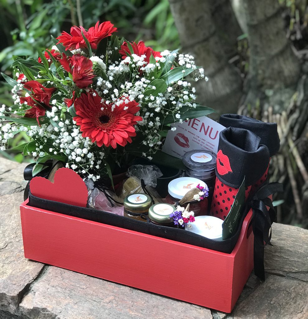 Cesta em MDF, pintada, com renda baiana, forrada com matelassê, sousplats em matelassê, cachepot de crochê para flor, xícaras em cerâmica Campestre, suspiros de framboesa, suco de uva integral, geleia de jaboticaba Lavorare, torradas da Carol, café Orfeu, manteiga, iogurte natural, granola caseira Lavorare, farofinha de aveia e coco Lavorare, mel, e morangos frescos.
