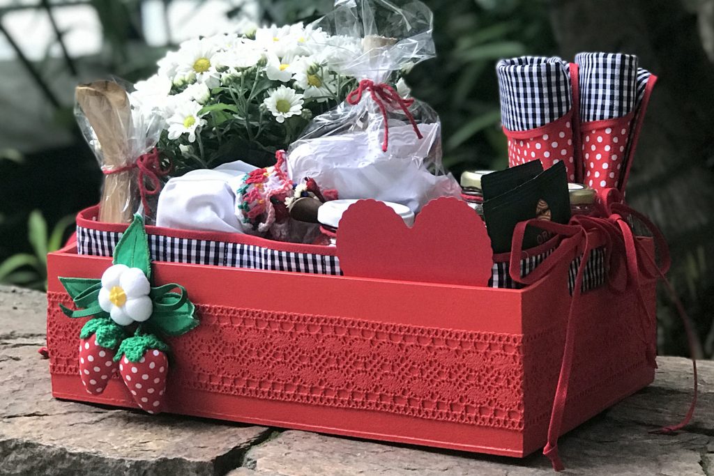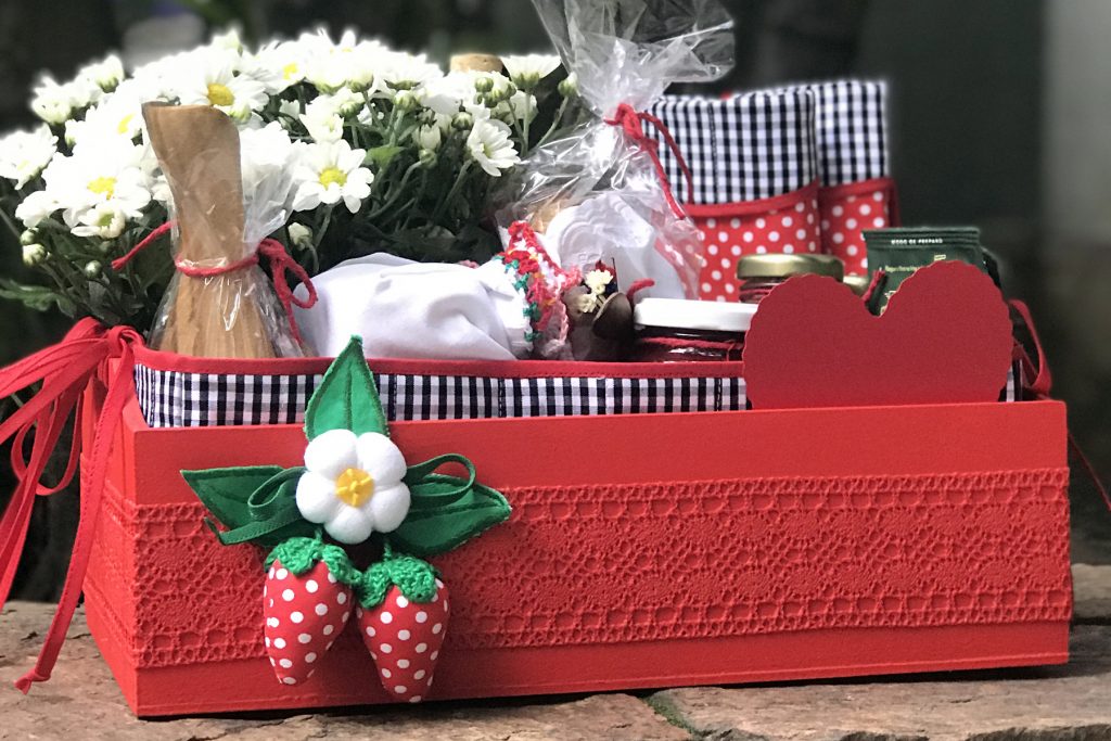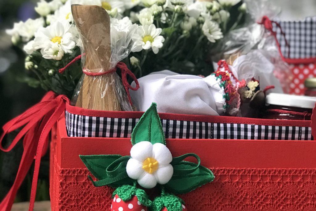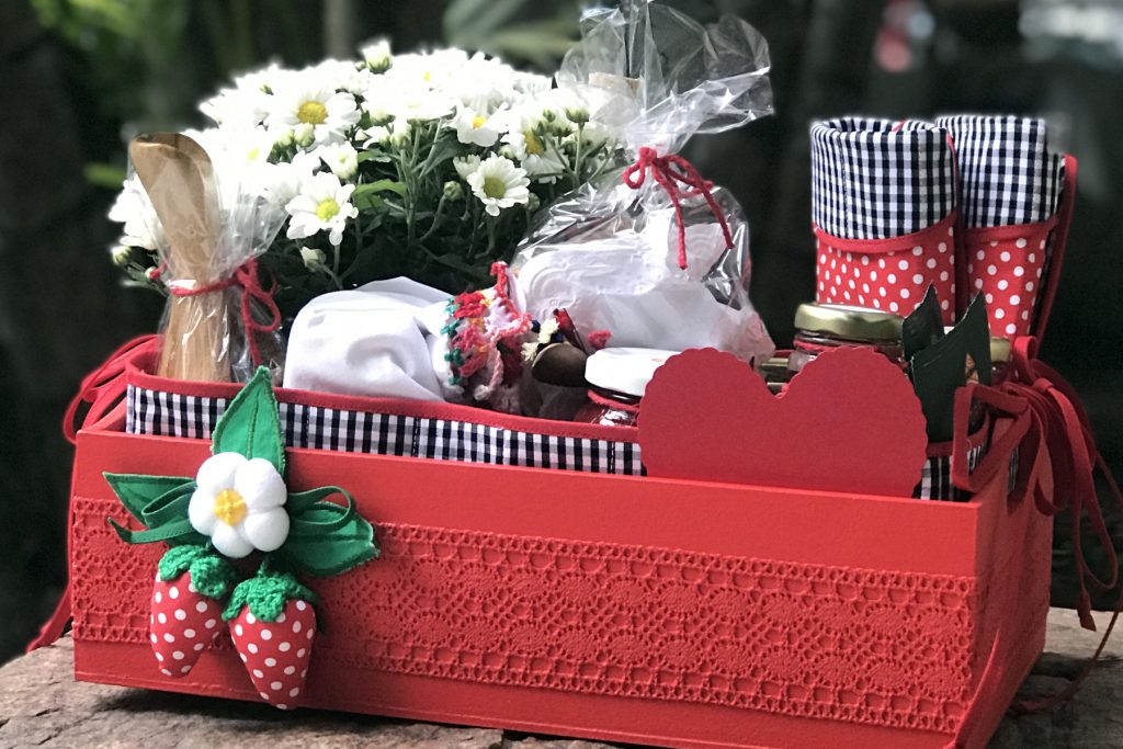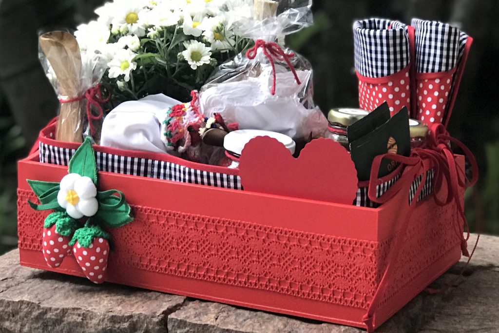 Cesta em MDF, pintada, forrada com matelassê, sousplats em matelassê, cachepot de crochê para flor, xícaras em cerâmica Campestre, suco de laranja, bolo inglês mármore, compota de jambo Lavorare, geleia de morango com limão siciliano Lavorare, torradas da Carol, salada de frutas, iogurte grego, granola Lavorare, mel, manteiga.