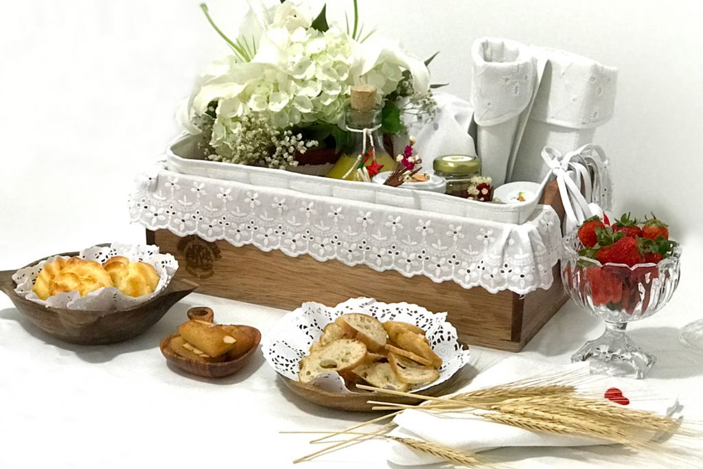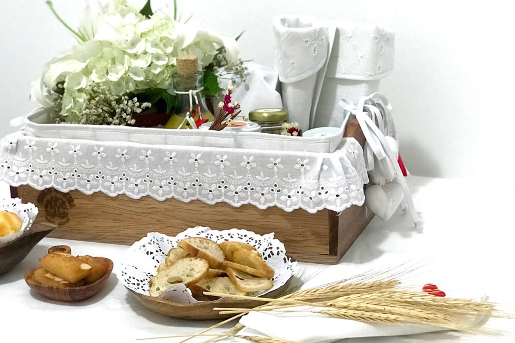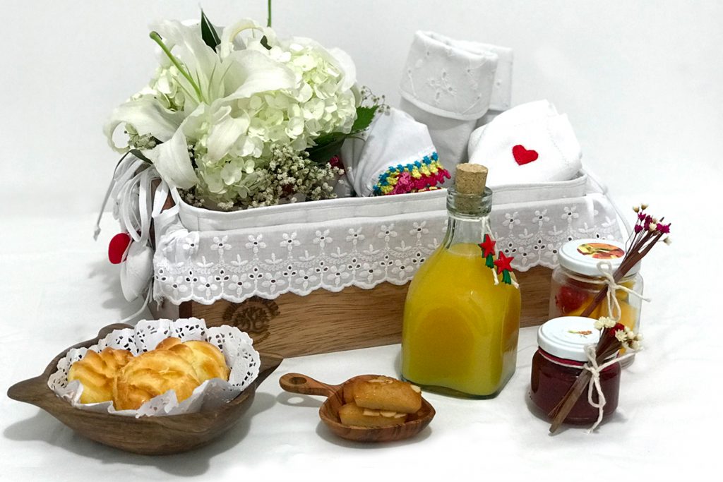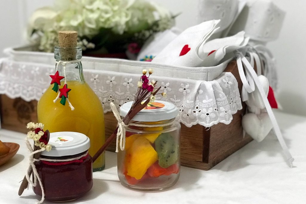 Cesta em madeira de reuso do Studio Madeira, forrada com matelassê, sousplats em matelassê, guardanapos de linho bordados, cachepot de crochê para flor, xícaras em cerâmica Campestre, suco de laranja natural, bolo inglês mármore, compota morangos Lavorare, geleia de morango com limão siciliano Lavorare, torradas da Carol, pão de queijo, salada de frutas, iogurte grego, granola Lavorare, mel, manteiga.